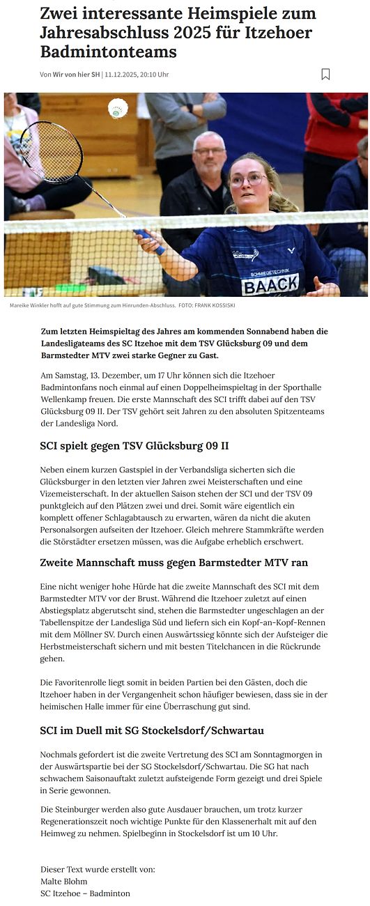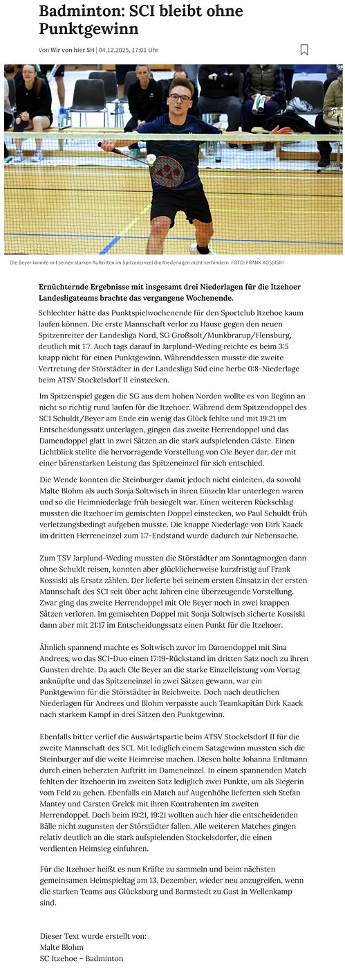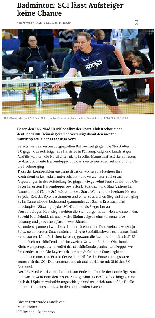 | Nach dem erfolgreichen Klassenerhalt in der Saison 2024/2025 hat sich die Zusammensetzung unserer ersten Mannschaft auch für die Punktrunde 2025/2026 verändert: Jane Junge wechselte von BW Wittorf zu uns und Malte Blohm kehrte aus der zweiten Mannschaft wieder zurück in die Erste. Kai Hansen wechselte zu einem anderen Verein. Carlotta von Leesen legt wegen eines Auslandsaufenthalt eine Spielpause ein. Ziel unseres Spitzenteams in dieser Saison ist es, am Ende im oberen Tabellendrittel zu landen. |